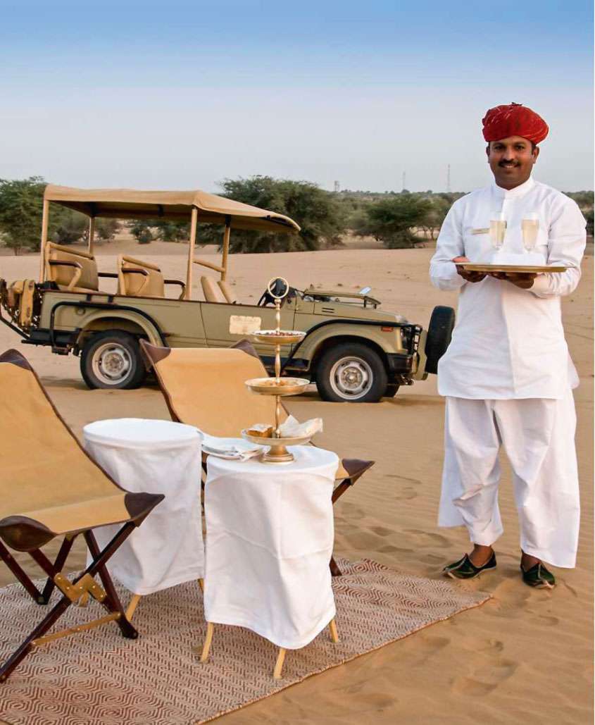Dans le désert du Thar se trouve The Serai Camp. Loin de toute agitation, du monde, et à quelques kilomètres de Jaisalmer, The Serai Camp est l’une de ces magnifiques nouvelles adresses que les Indiens aiment offrir aux amoureux du Rajasthan. Ce lieu somptueux noté parmi les 10 plus beaux camps installés dans un environnement désertique offre des prestations de rêve à ses hôtes.